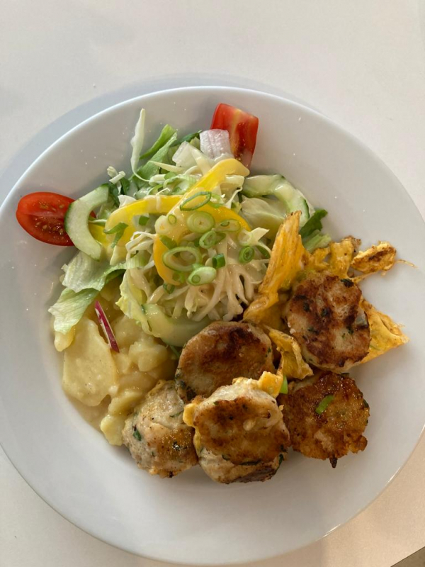 drei angebratene semmelknödel mit ei und salat